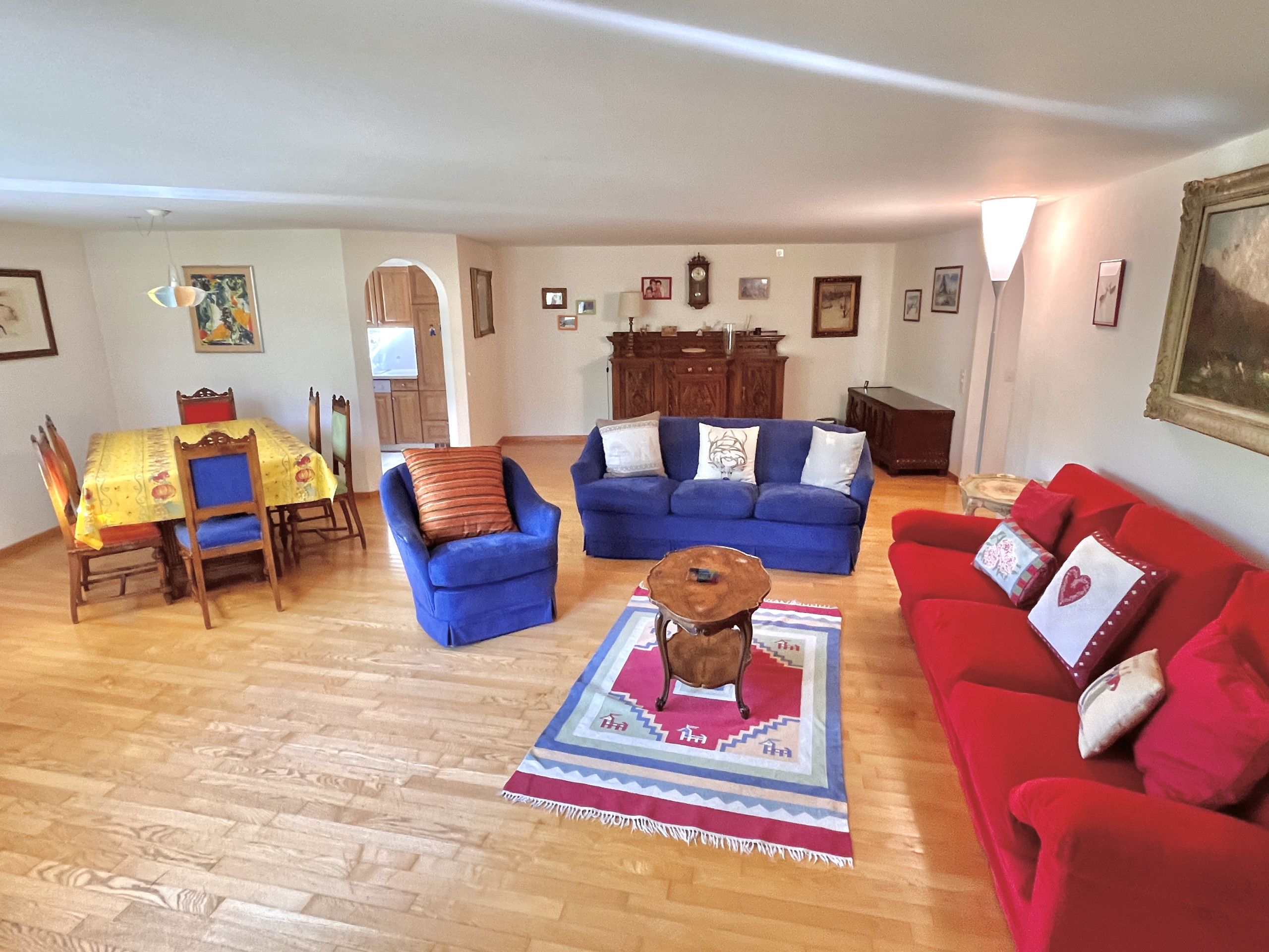 La zona giorno comprende un angolo pranzo e un ampio e luminoso soggiorno con accesso al balcone esposto a sud-ovest, dal quale si può godere di una splendida vista sulle montagne engadinesi. I due divani del salotto possono essere trasformati in letti singoli, permettendo così di ospitare fino a un massimo di 6 persone. La cucina, separata, è completamente attrezzata, dotata di lavastoviglie e di tutto il necessario per un soggiorno confortevole; dispone inoltre di un secondo tavolo per i pasti.