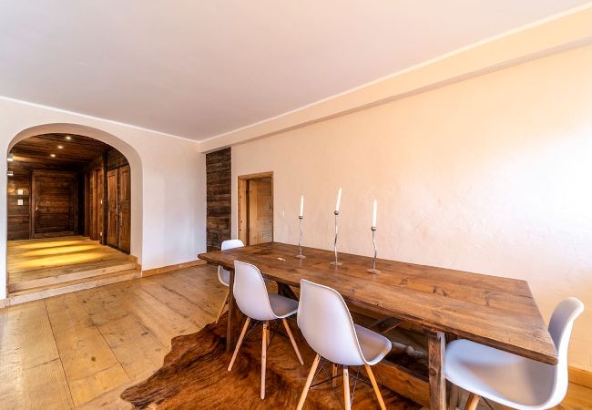 L’appartamento si trova al primo piano dell’edificio, accessibile tramite scala dall’ingresso principale, e si sviluppa tutto su un unico livello. L’interno offre spazi ampi e ben organizzati, perfetti per accogliere famiglie o gruppi di amici. Il soggiorno e la sala da pranzo sono uniti in un unico ambiente luminoso e conviviale, arredato con un grande tavolo da pranzo e affacciato su un ampio balcone che regala una splendida vista sulle montagne engadinesi.