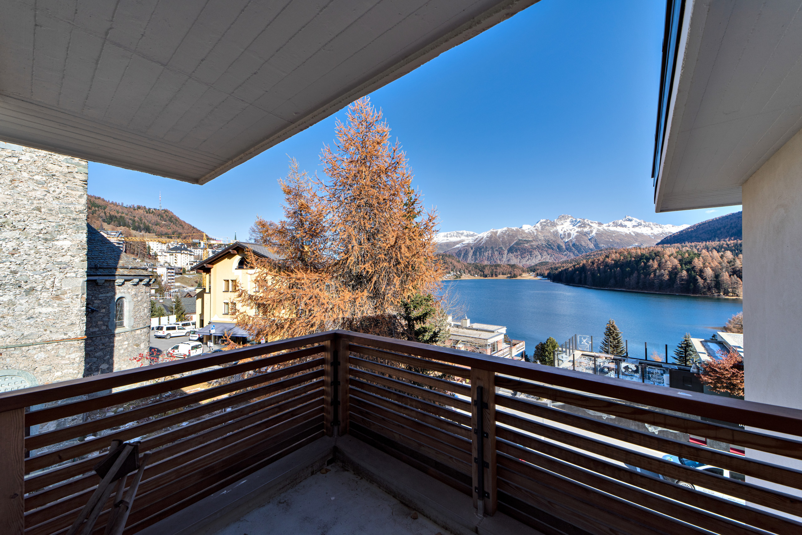 Il soggiorno, luminoso e confortevole, è perfetto per il relax dopo giornate trascorse sulle piste, in escursione o a fare shopping nel centro. Uno dei punti di forza è la terrazza, che offre una splendida vista sul lago di St. Moritz e sulle montagne circostanti — ideale per colazioni all’aperto o momenti di relax al tramonto.