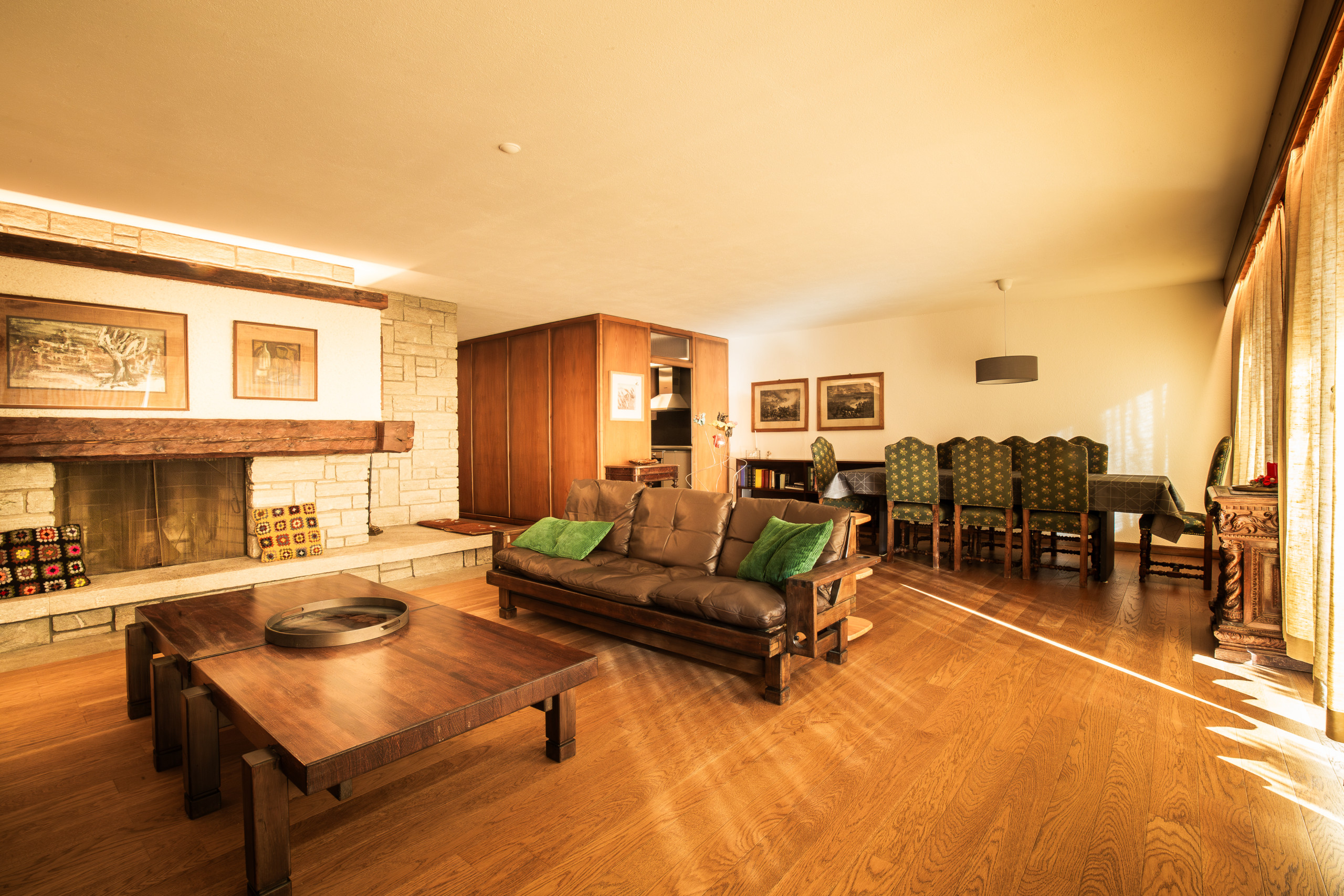 L’alloggio, di circa 100 metri quadrati, si trova al terzo piano di un condominio dotato di ascensore e si sviluppa interamente su un unico livello. L’ingresso si apre su una luminosa zona living, dove soggiorno e sala da pranzo convivono in un ambiente accogliente e spazioso, con un grande tavolo per otto persone. Da qui si accede alla terrazza, perfetta per rilassarsi ammirando la vista sulle montagne engadinesi. La cucina, separata e ben attrezzata, dispone di forno, lavastoviglie, piano cottura a quattro fuochi e macchina per il caffè espresso.