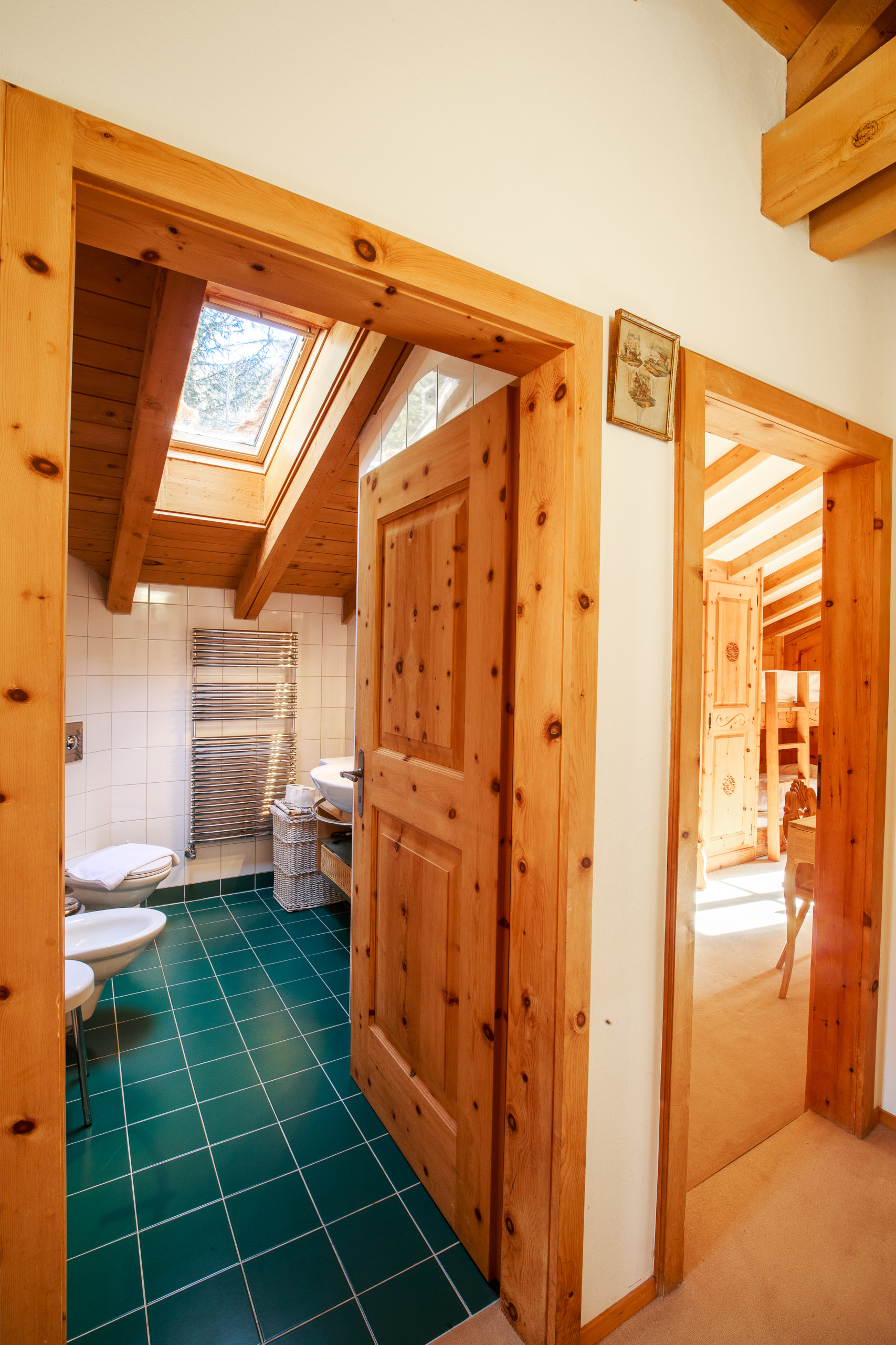 Salendo al piano superiore tramite scala interna si accede alla zona notte, composta da tre camere: la prima è una doppia con letti a castello, la seconda una spaziosa quadrupla con due letti a castello, mentre la terza è una doppia con due letti singoli che possono essere uniti per formare un matrimoniale. Sullo stesso piano si trovano due bagni: uno con doccia, lavabo, bidet e WC; l’altro con vasca con doccia, lavabo, bidet e WC.