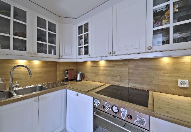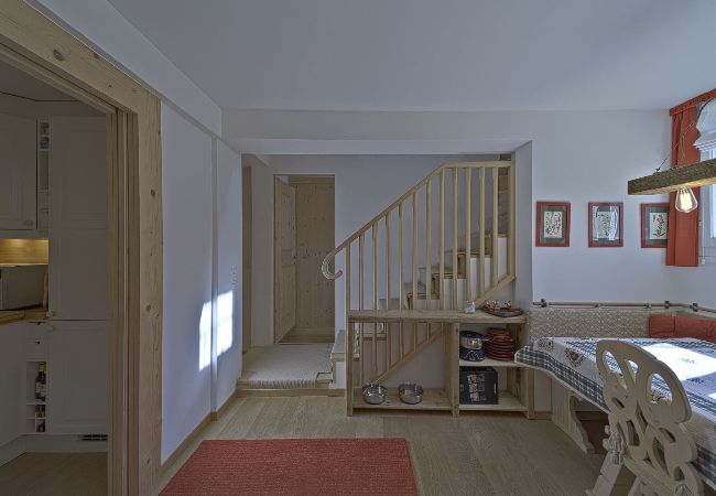 Drei Räume im ersten Stock von etwa 80m2, vollständig renoviert. Eingang mit Garderobe. Bad/WC/Waschbecken und Bidet, offene Küche mit Kühlschrank, Geschirrspüler, Kaffeemaschine und Ofen. Wohn-/Esszimmer mit Ausgang zum Balkon. Radio, TV, Internet. Schlafzimmer mit Doppelbett und Zimmer mit Stockbett. Neue und komfortable Einrichtung. Gemeinschafts-Waschraum und Skiraum. Ein Stellplatz in der Garage. Nur für Nichtraucher.