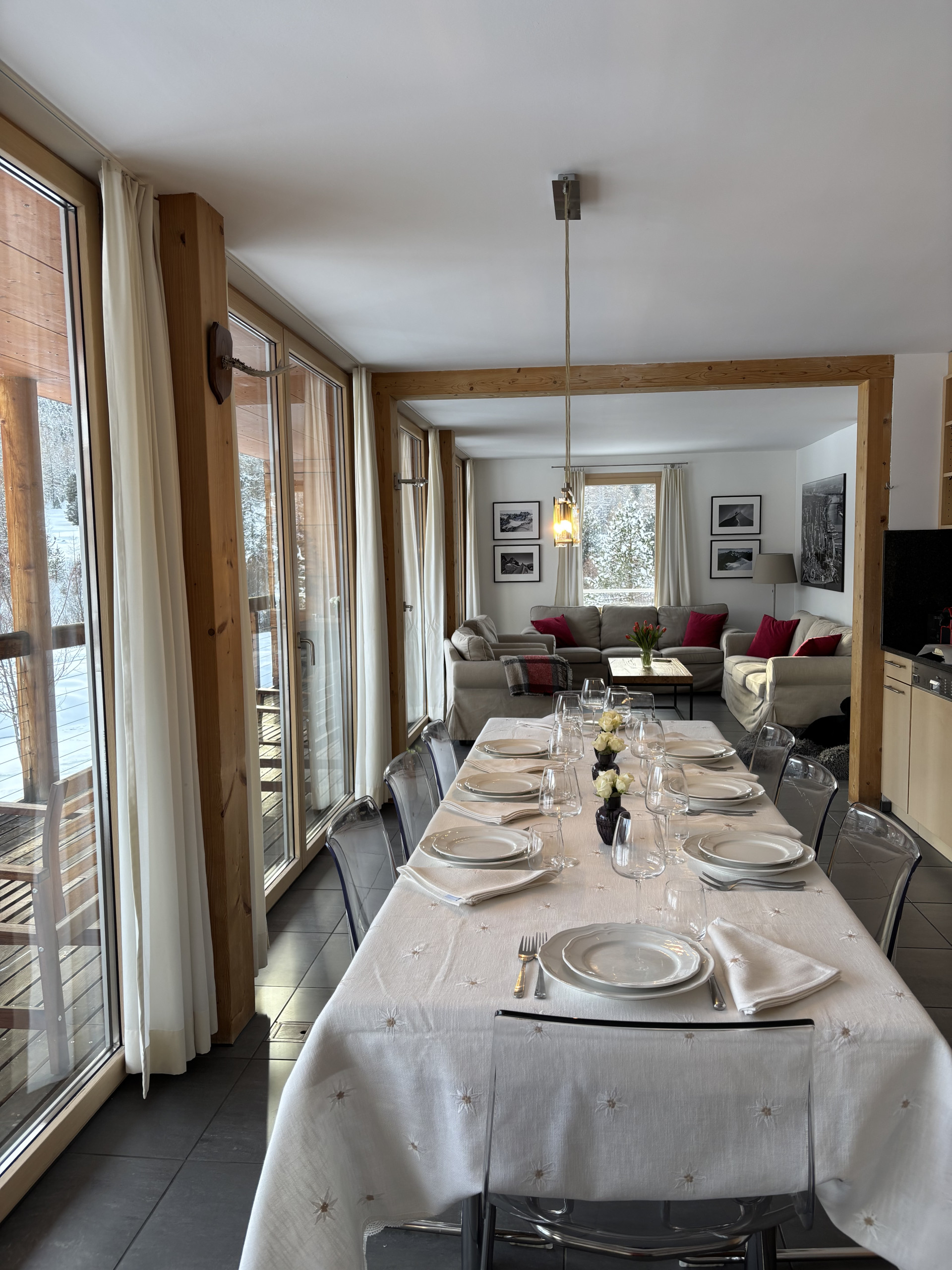 Das Wohnzimmer mit großer offener Küche schafft eine besonders einladende Umgebung. Die Terrasse, die sich entlang des Wohn- und Fernsehraums erstreckt, bietet einen unvergleichlichen Blick auf die Berge des schönen Engadins.