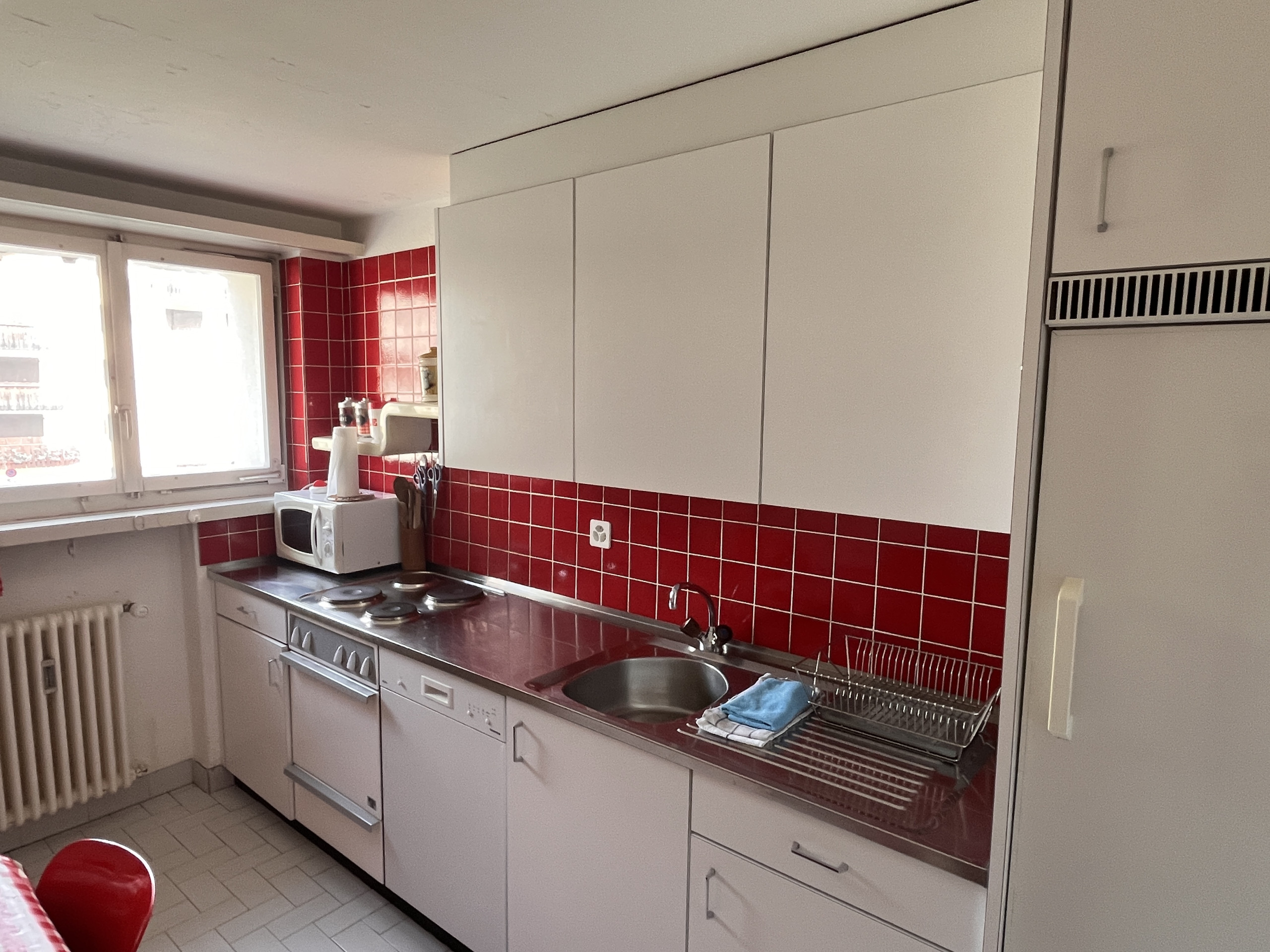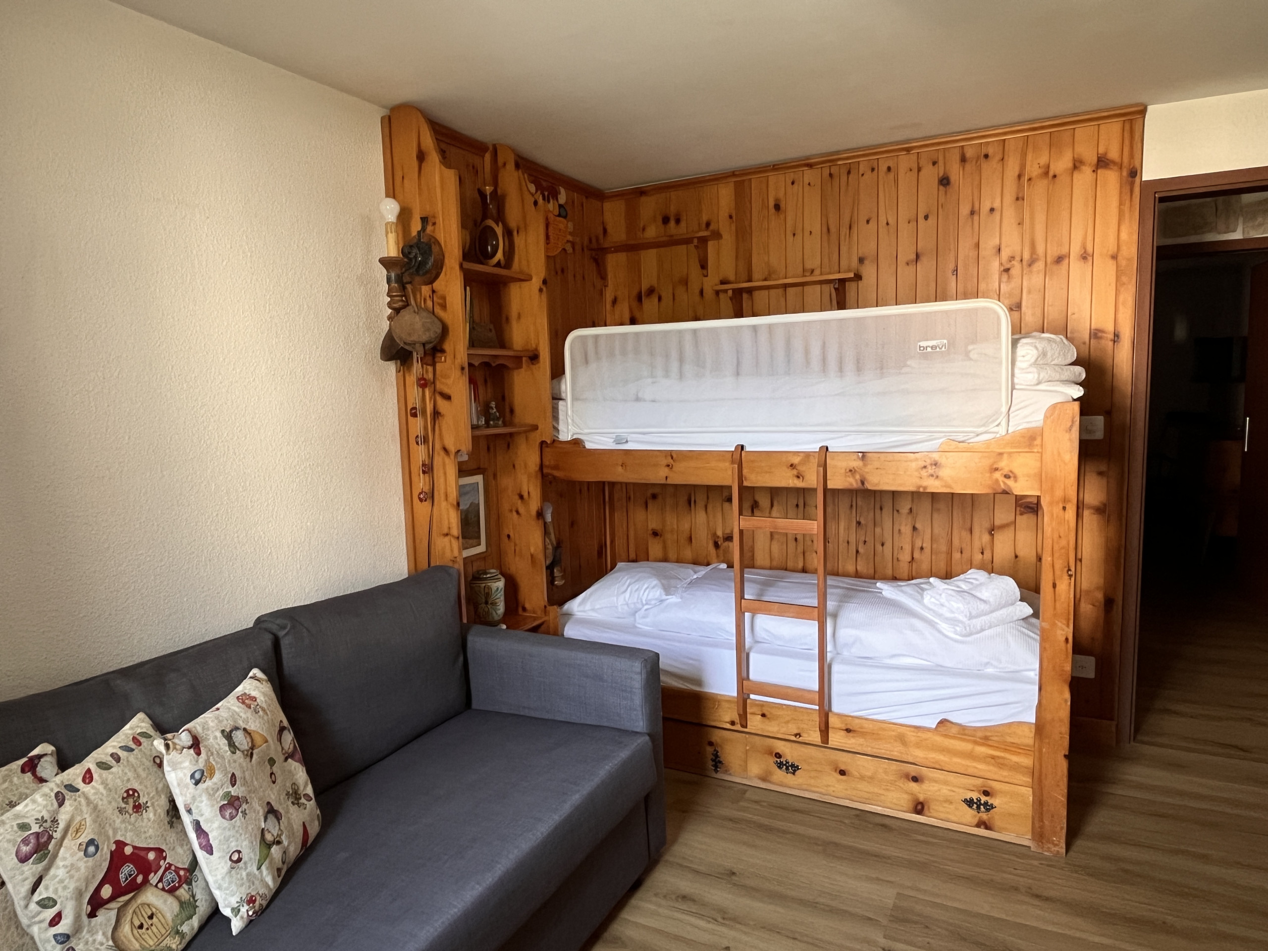 This cosy and functional two-room apartment is ideal for a couple or a small family. The sleeping area is integrated into the living area: the living room hosts a sofa that transforms into a bed, offering flexible accommodation for the night. The living space also consists of a fully equipped kitchen (with oven, refrigerator and dishwasher) and a dining corner with a table for four people, perfectly united in a single and bright environment.