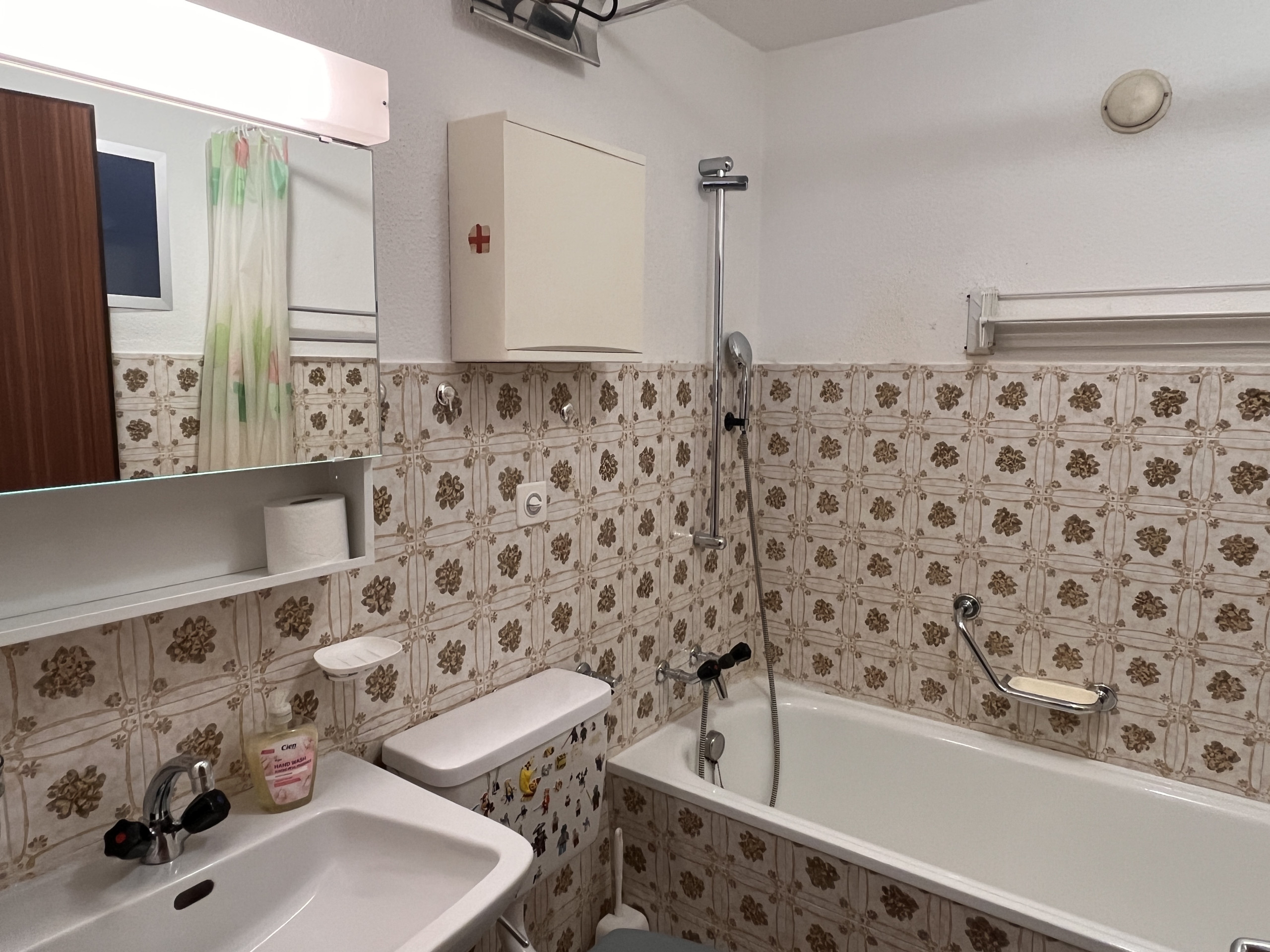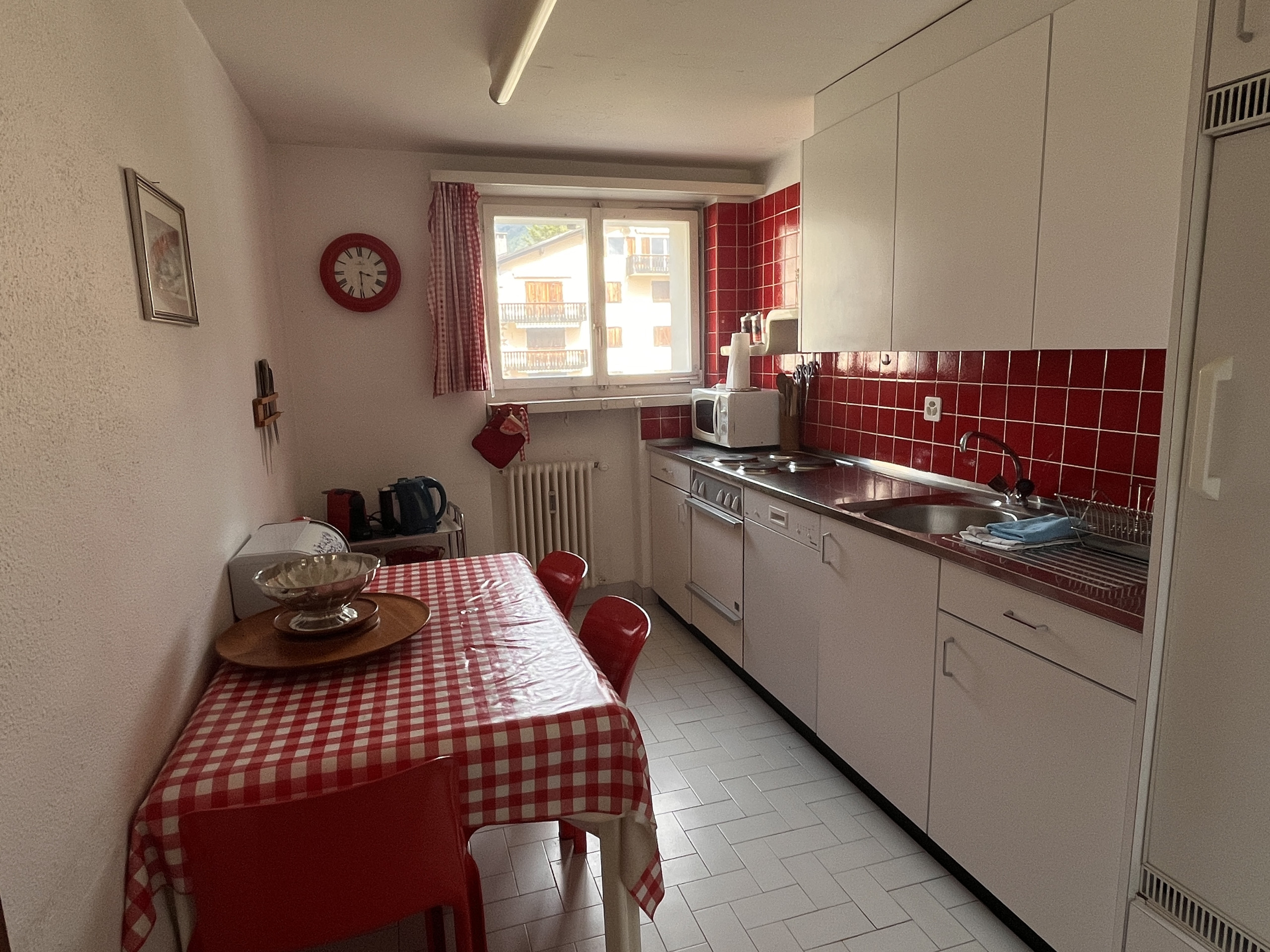 This cosy and functional two-room apartment is ideal for a couple or a small family. The sleeping area is integrated into the living area: the living room hosts a sofa that transforms into a bed, offering flexible accommodation for the night. The living space also consists of a fully equipped kitchen (with oven, refrigerator and dishwasher) and a dining corner with a table for four people, perfectly united in a single and bright environment. The bathroom is complete with washbasin, bathtub with shower, WC and bidet, offering everything necessary for a comfortable stay.