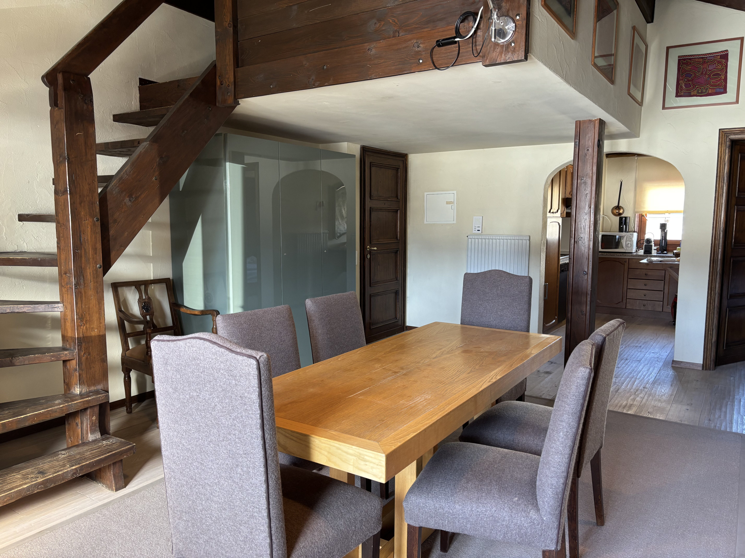 The apartment, located on the top floor of the building and accessible via stairs, is developed on two levels.