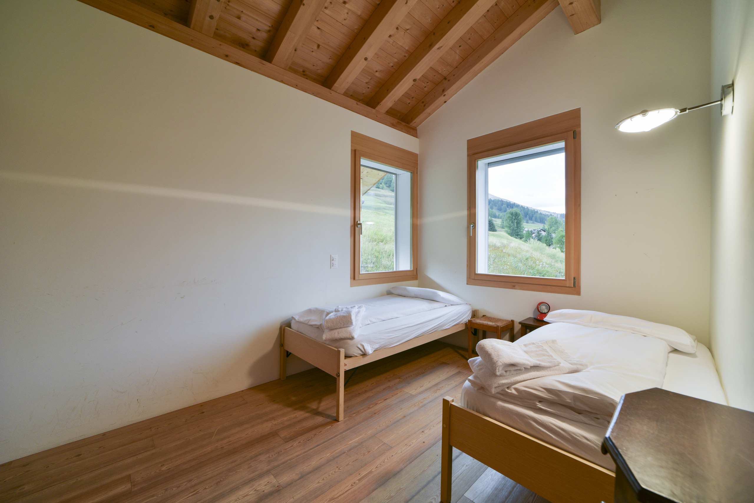 The second level, accessible exclusively via internal stairs, leads to an additional attic area, where two single beds, a sofa and an additional bathroom with spacious shower cubicle, washbasin and WC are located.