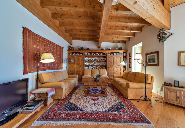 The living room, with a large open-plan kitchen, creates a particularly welcoming environment. The terrace, which extends along the living room and TV room, offers an unparalleled view of the mountains of the beautiful Engadin.
