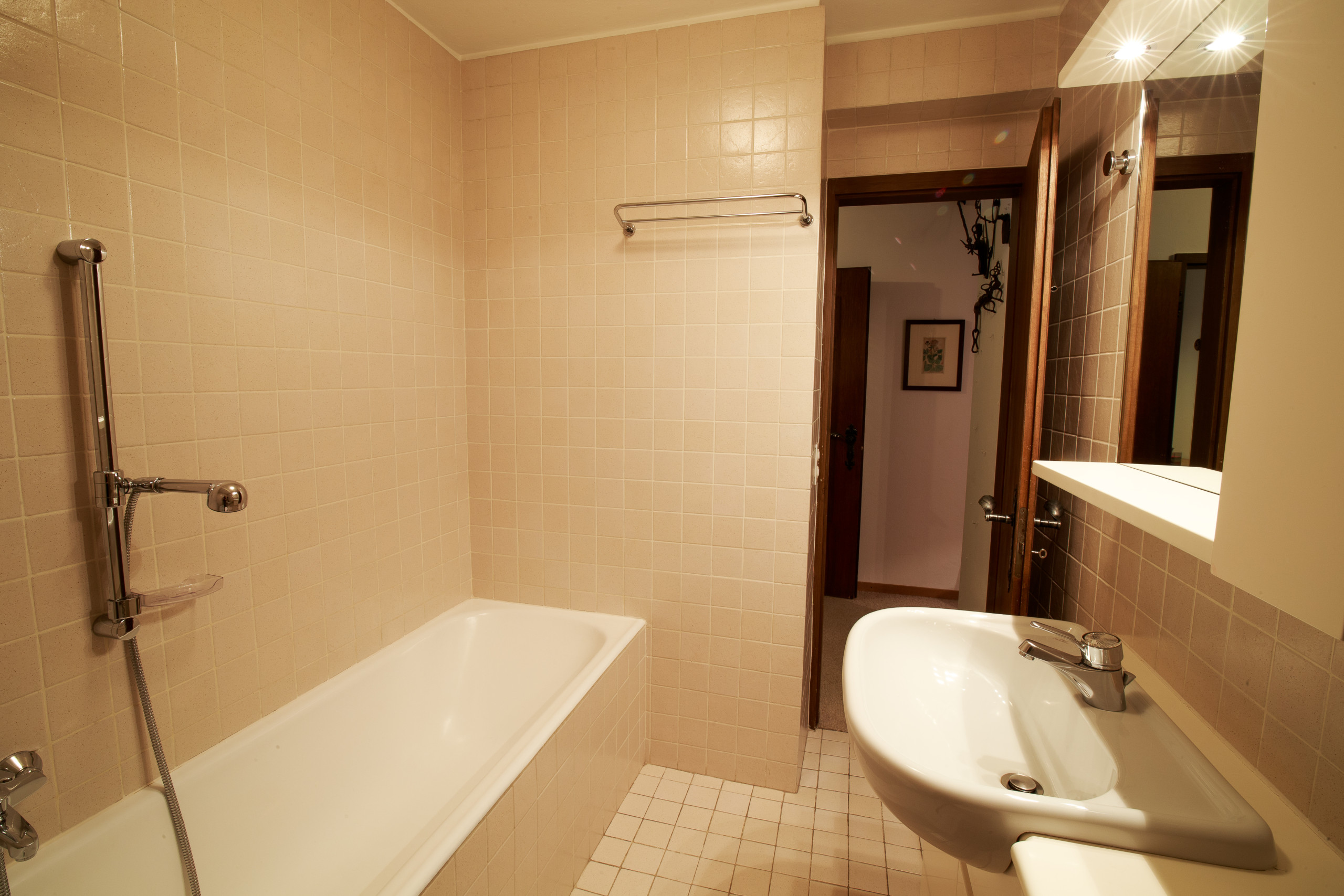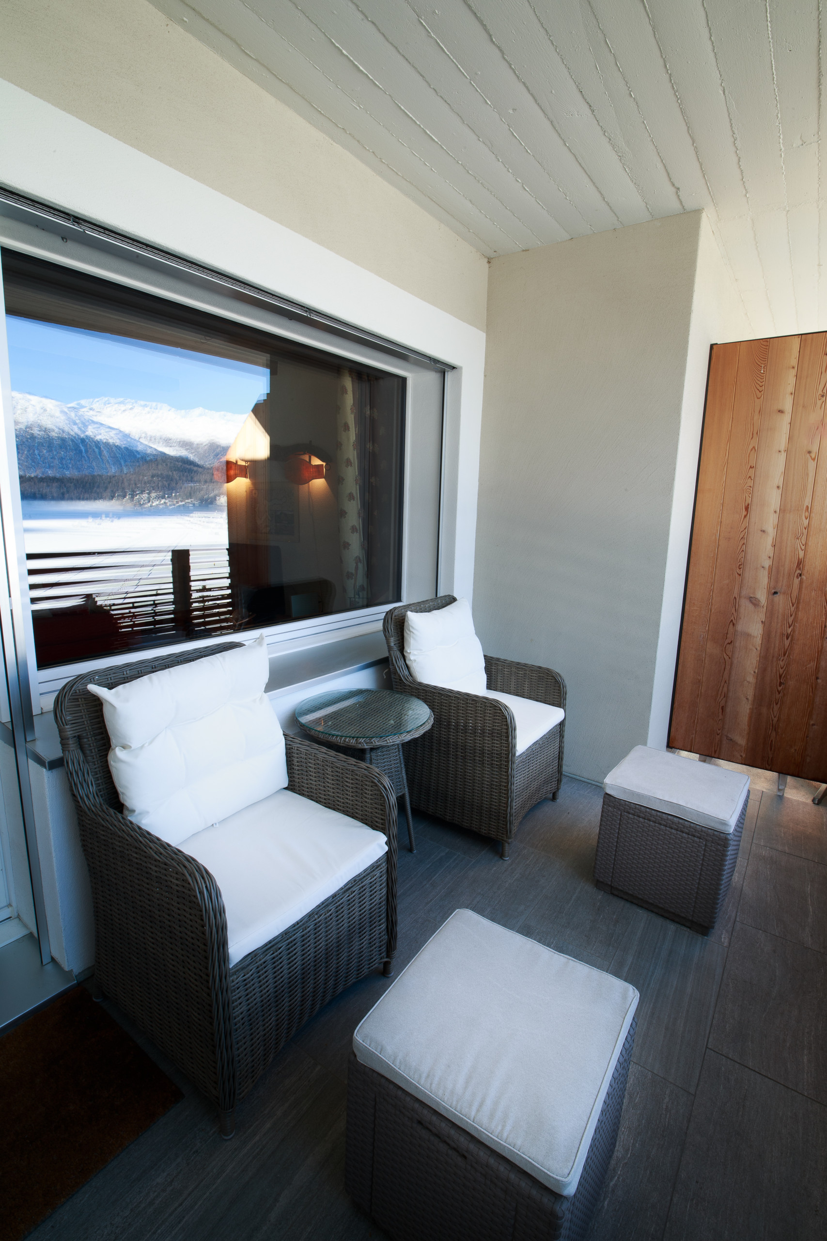 The living room, bright and comfortable, is perfect for relaxing after days spent on the slopes, hiking or shopping in the centre. One of its strengths is the terrace, which offers a splendid view of Lake St. Moritz and the surrounding mountains — ideal for outdoor breakfasts or moments of relaxation at sunset.