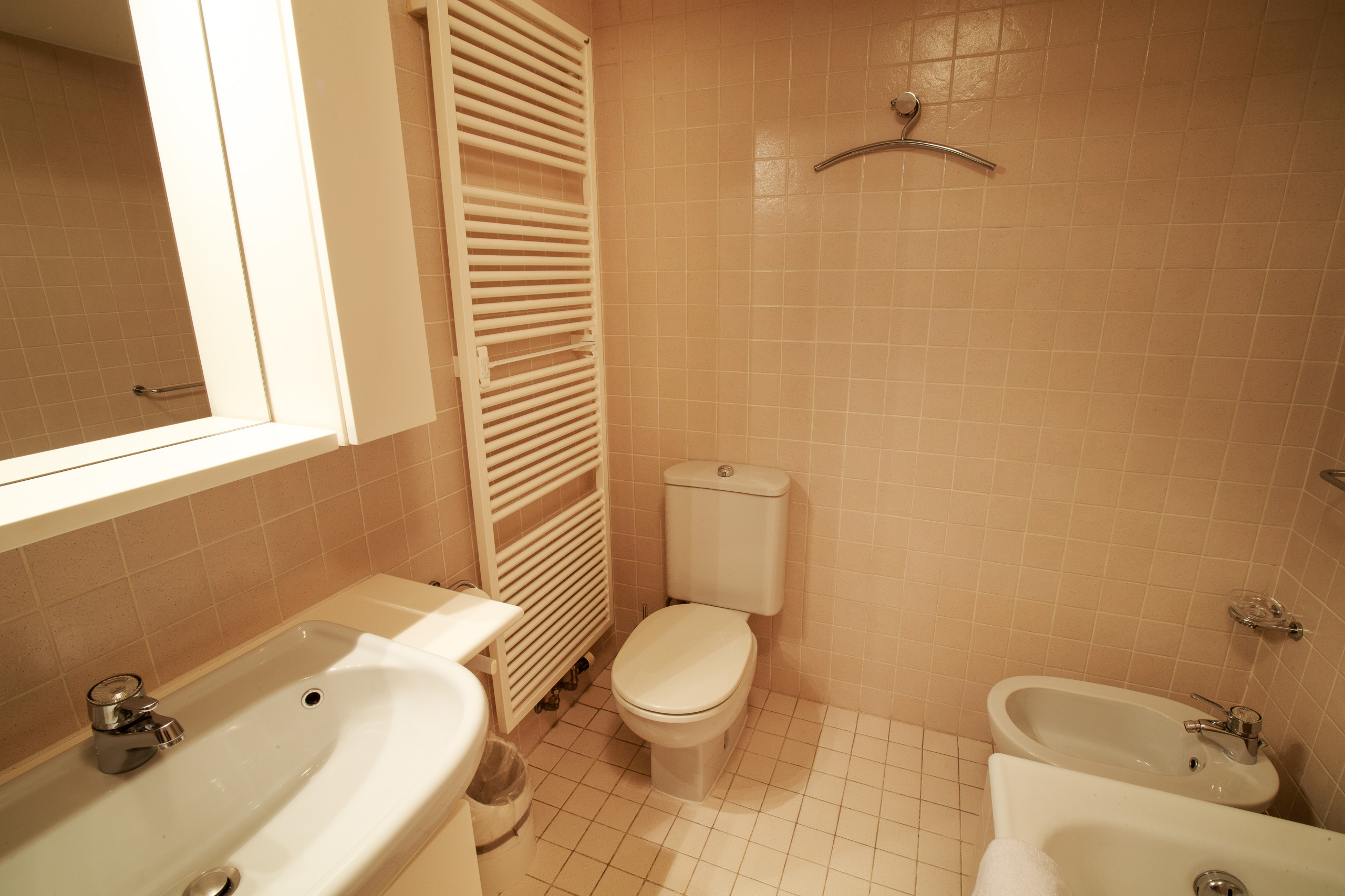 The night area includes two well-organised bedrooms: a double bedroom with a private balcony and view, and a bedroom with two single beds, suitable for families or groups of friends. Two bathrooms are available — one with a bathtub, washbasin and bidet; the other with a shower and washbasin — ensuring privacy and practicality.