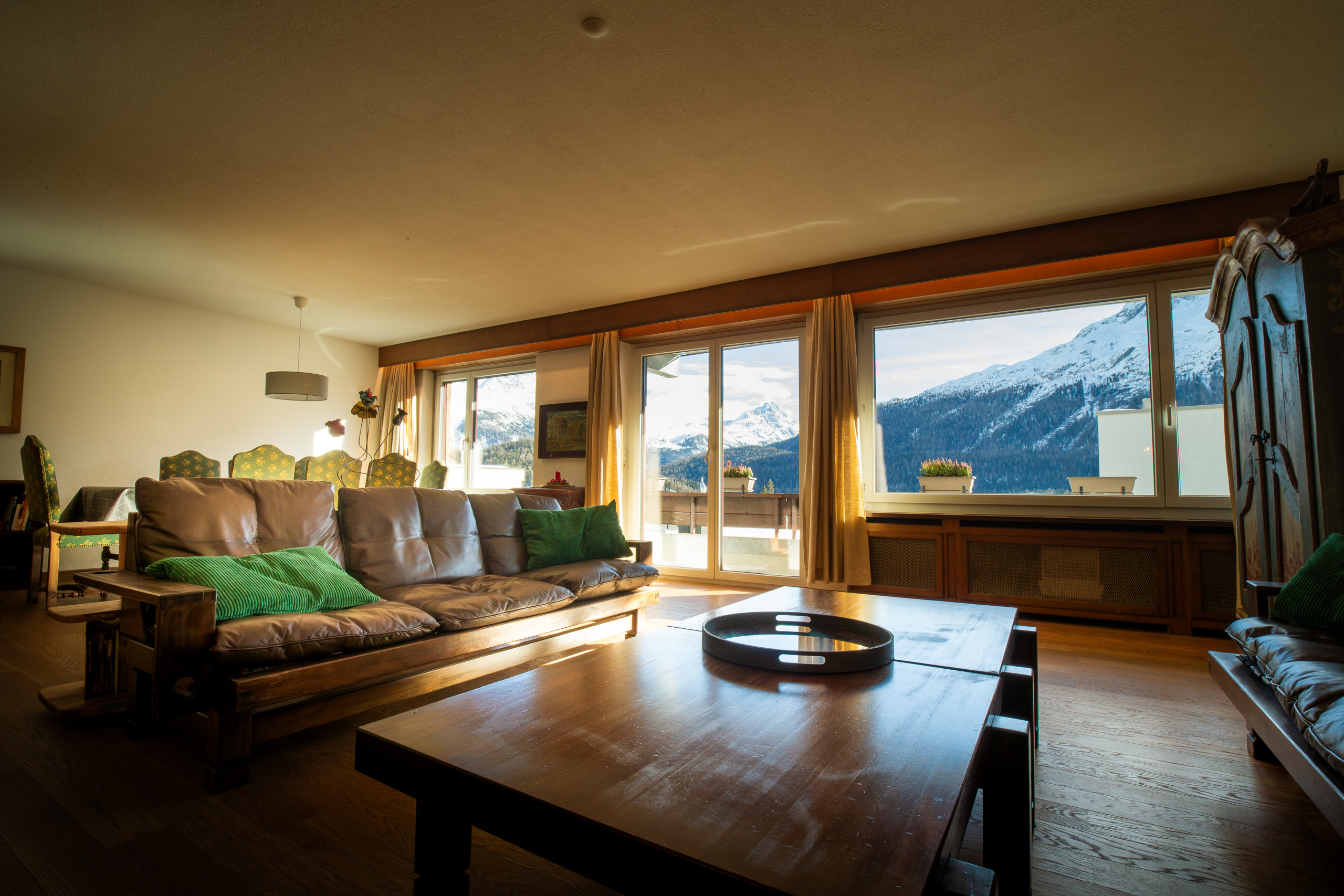 Suot Brattas 22 is a spacious apartment located in the heart of St. Moritz Dorf, right in front of the Kulm Country Club. The location is particularly convenient: a bus stop is just a few steps away, the train station is about a kilometre away, and the Coop supermarket can be reached within a few minutes on foot. The pedestrian centre of St. Moritz is also nearby and easily accessible.