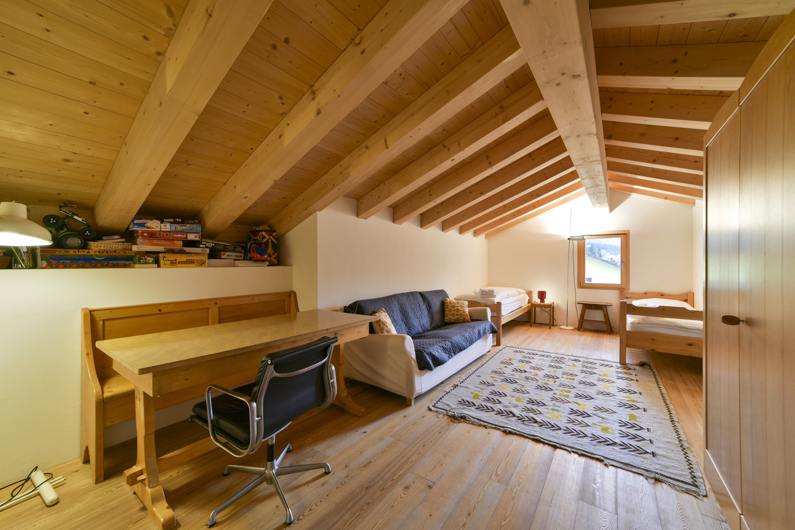 Le deuxième niveau, accessible uniquement par un escalier intérieur, mène à une zone de combles supplémentaire, où se trouvent deux lits simples, un canapé et une salle de bain supplémentaire avec une grande douche, un lavabo et des toilettes.