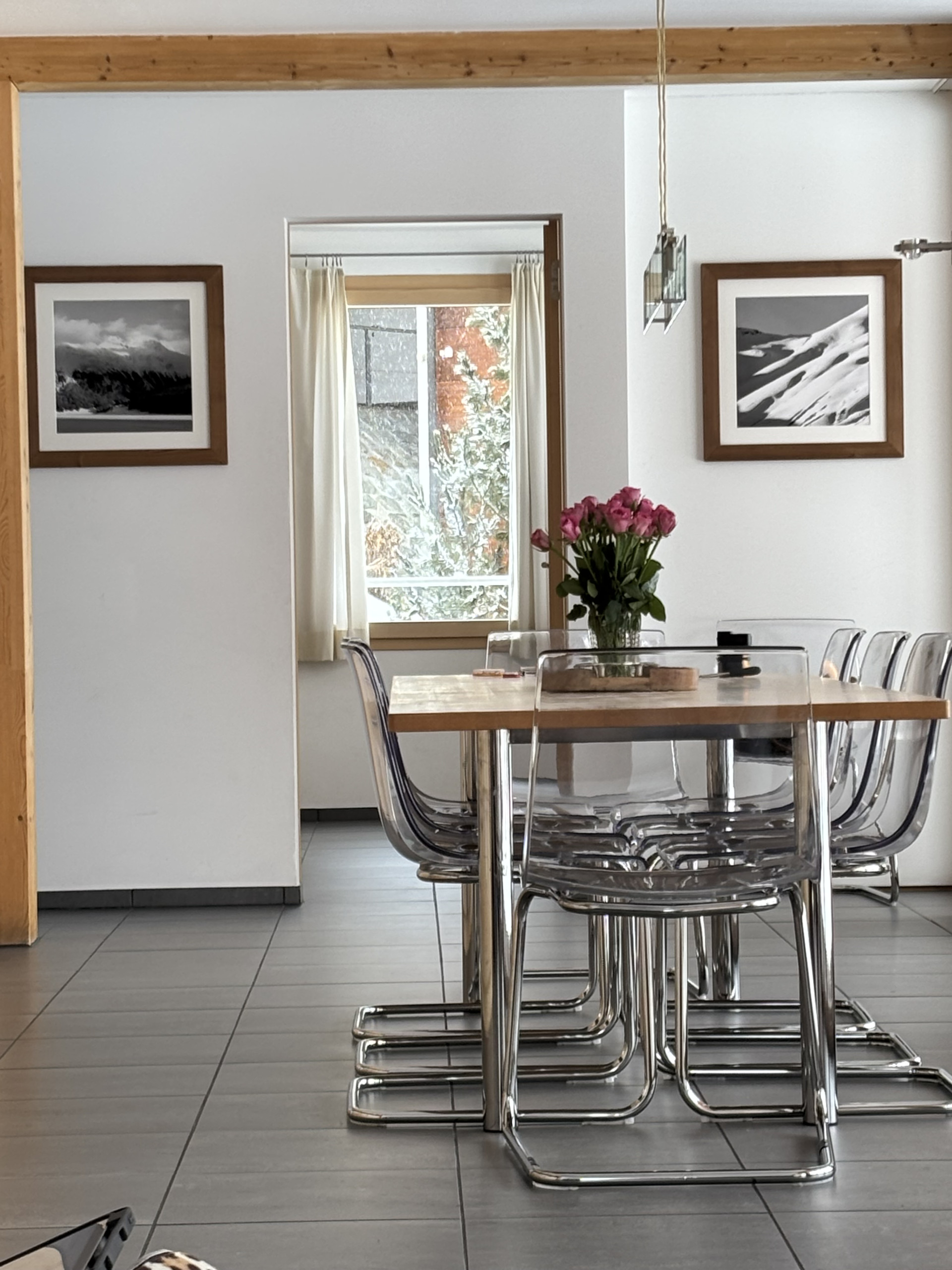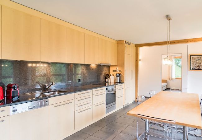 Le salon, avec sa grande cuisine ouverte, crée un environnement particulièrement accueillant. La terrasse, qui s'étend le long du salon et de la salle de télévision, offre une vue imprenable sur les montagnes de la magnifique Engadine.